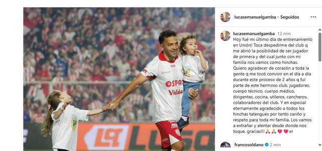 Lucas Gamba se despidió del mundo Unión en su cuenta de Instagram, y recibió la ovación de hinchas, compañeros y excompañeros.