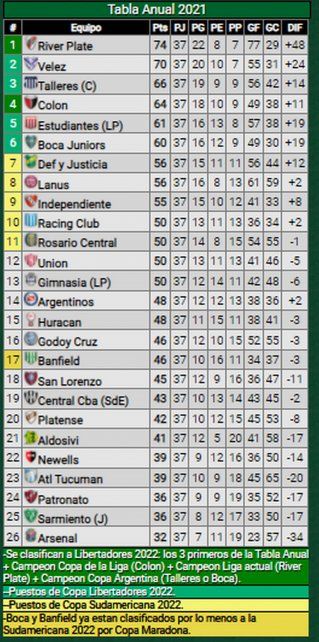 Pero, además, con la derrota en el Clásico, necesitaría que Gimnasia pierda ante Patronato y que Argentinos no le gane a Sarmiento. El partido entre Central y Argentinos no contaría, ya que cualquier resultado en dicho cotejo será suficiente para que cualquiera de los dos equipos termine arriba en la tabla acumulada.