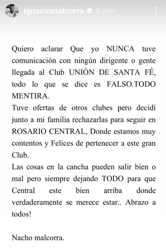El inicio de la Copa de la Liga Profesional para Rosario Central está lejos de lo planeado, ya que está sintiendo mucho la salida de Alejo Véliz, y viene de empatar en su debut como local ante Atlético Tucumán, mientras que en la segunda jornada perdió por goleada ante Banfield. Y uno de los jugadores apuntados por este presente es Ignacio Malcorra, quien en las últimas horas se refirió a los rumores que lo vincularon a Unión, en sus redes sociales.