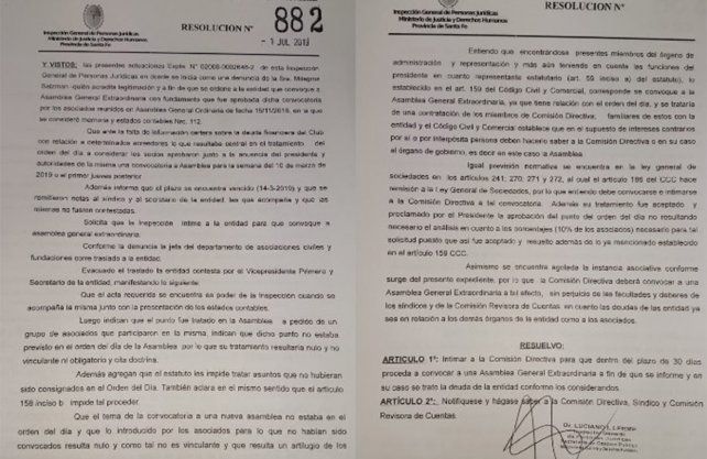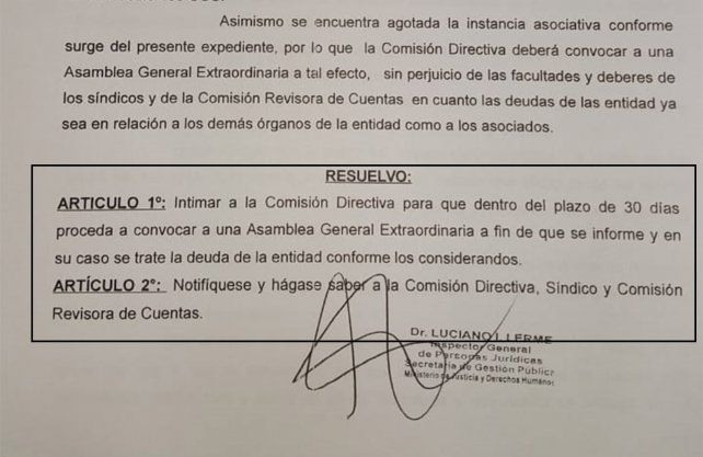Esto fue mediante un documento de tres hojas con membrete a la sede. Dentro de lo que se menciona, se expone: “Intimar a la Comisión Directiva para que dentro del plazo de 30 días proceda a convocar a una Asamblea General Extraordinaria a fin de que se informe y en su caso se trate la deuda de la entidad conforme los considerandos”.