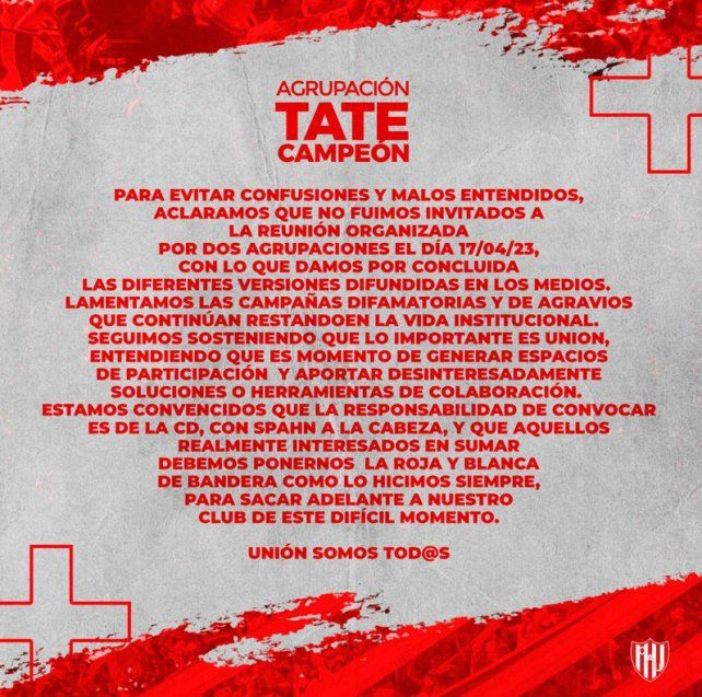 La Agrupación Tate Campeón aclaró que no recibió la invitación para reunirse con el resto de la oposición.