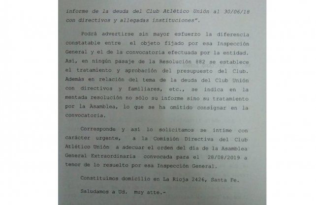 La nota presentada y que acompaña el presente artículo, dirigida al Dr. Luciano Lerme, intima a que "la CD de Unión adecúe el orden del día de la Asamblea General Extraordinaria a tenor de lo resuelto por la Inspección General de Personas Jurídicas".