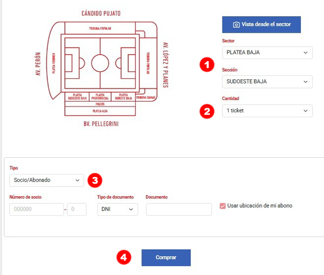 1- Seleccionar el sector y la sección de dicho sector. Por ej: Platea Alta – Preferencial Alta