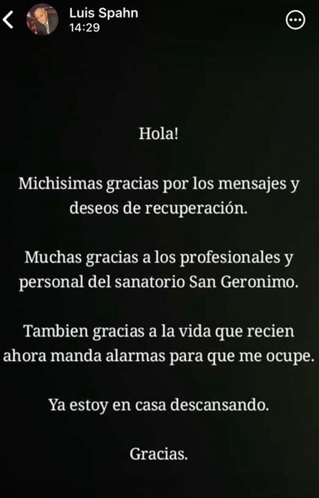 "Muchísimas gracias por los mensajes y deseos de recuperación. Muchas gracias a los profesionales y personal del sanatorio San Gerónimo. También gracias a la vida que recién ahora manda alarmas para que me ocupe. Ya estoy descansando en casa. Gracias", expresó.